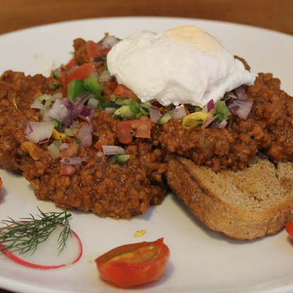 Sloppy John over Garlic Toast topped with Poached Egg and Scallions